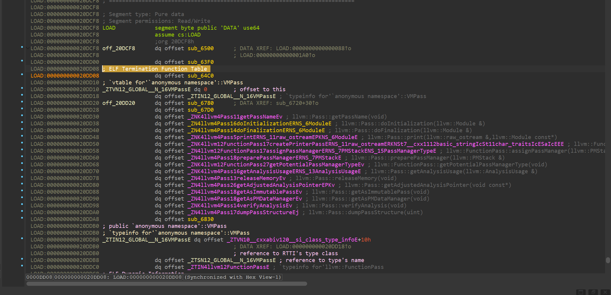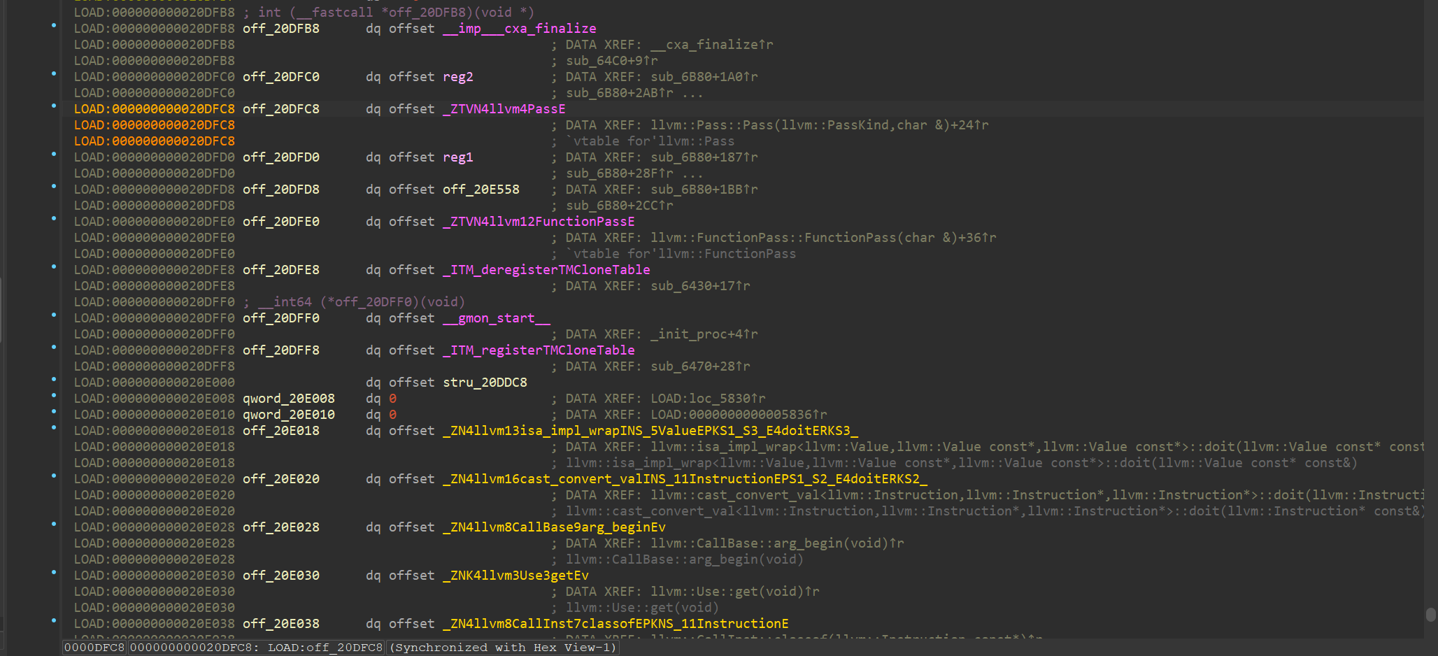 这里确是跟.rdata段有交叉引用,而且从function窗口也能看出来length也是相对其他函数较大,所以这里应该是runOnFunction函数,runOnFunction函数一般是在虚表最后满足length足够大且与.rdata段交叉引用