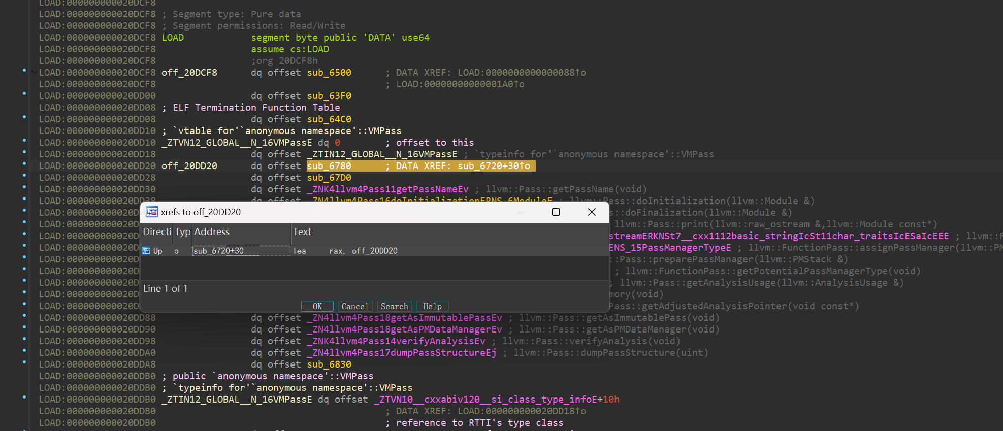可以看到sub_6780函数出现了DATA XREF,这是代表这函数被交叉引用,但是这个函数包括上面这几个函数功能都很单一 一般来讲,虚表底下的函数一般就是runOnFunction,因为这个函数是最后被修改的,点进sub_6830