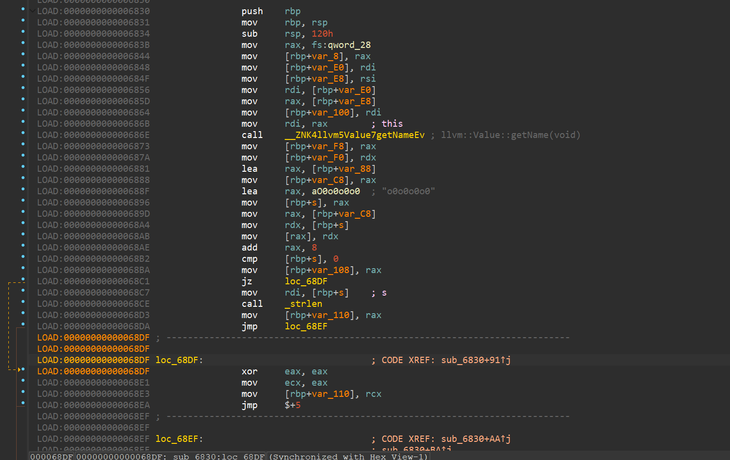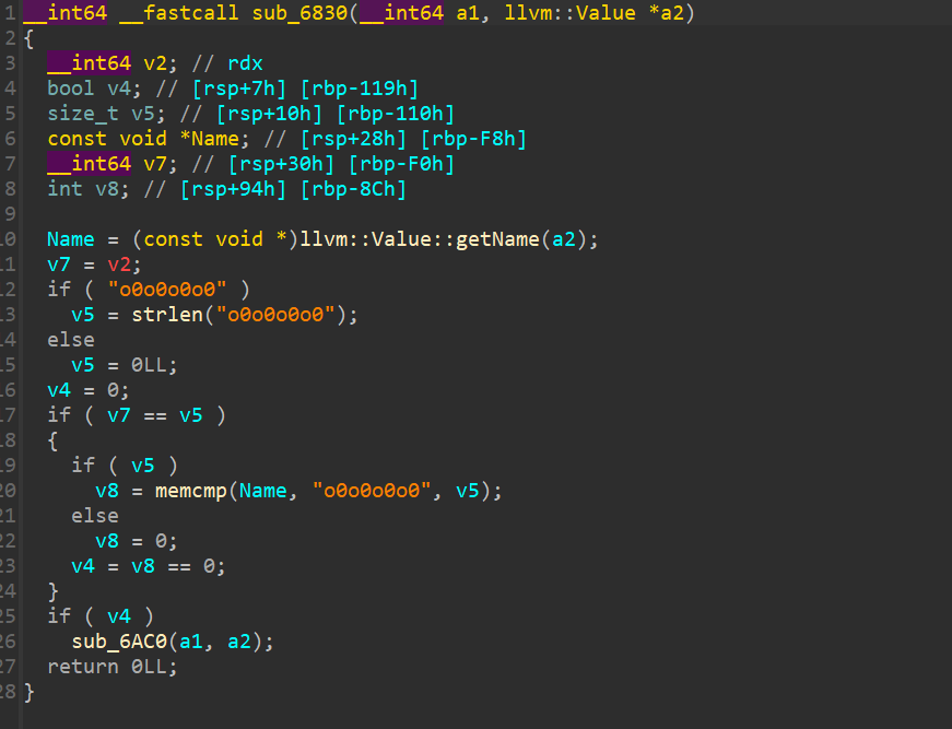 这里只有getName、strlen和memcmp这三个,但是这三函数不会修改内存地址,getName是获取函数名,只要函数名为o0o0o0o0那么v4就不会等于0,就会执行sub_6AC0,也就是这个pass只会对o0o0o0o0这个函数进行处理 只能再看一下sub_6AC0