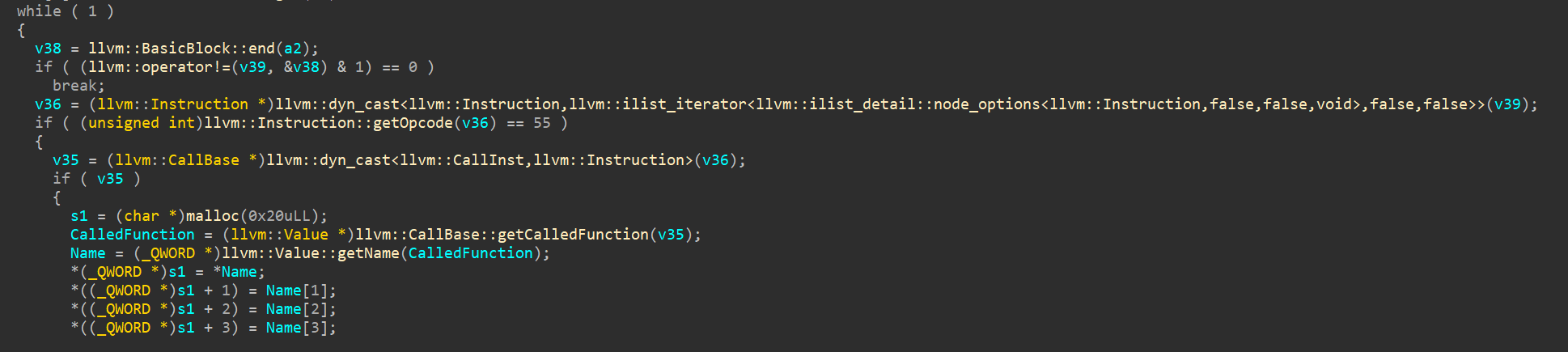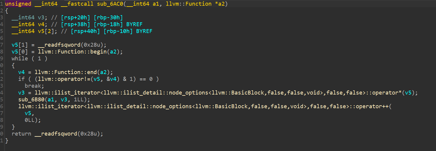 这里有一个循环 llvm::Function::begin和llvm::Function::end都是Function类的迭代器对象,其迭代的对象是函数中的基本块。因此这个循环的意思就是对每一个基本块执行sub_6B80函数。其中v3 = (llvm::BasicBlock
