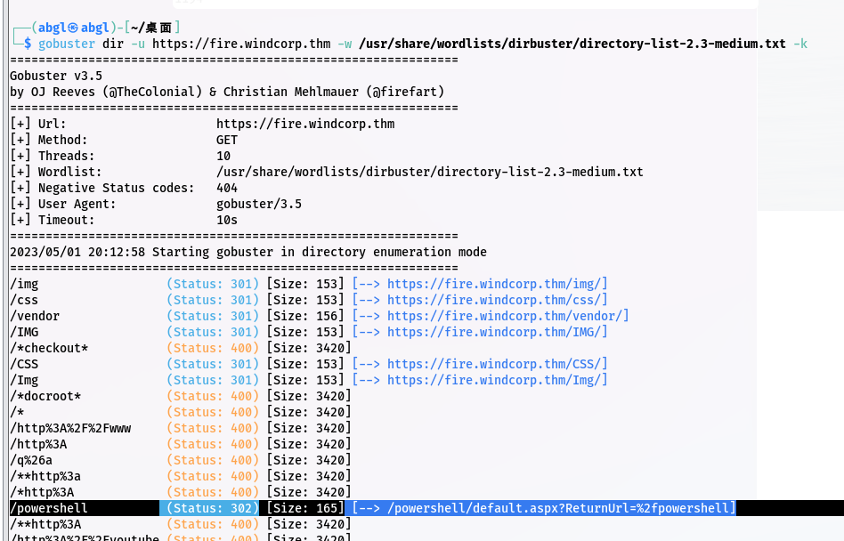 gobuster dir -u <https://fire.windcorp.thm> -w /usr/share/wordlists/dirbuster/directory-list-2.3-medium.txt -k