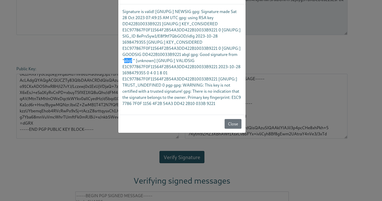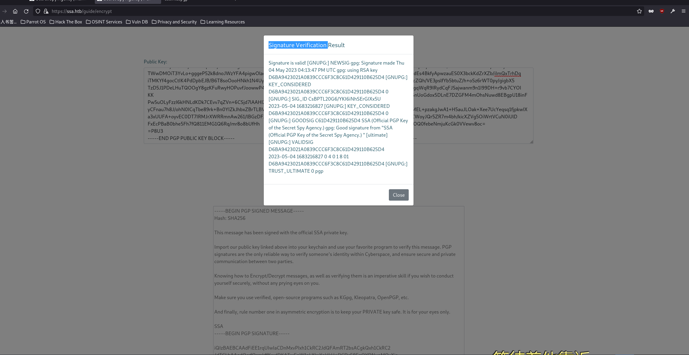 在guide界面,用pgp给的测试用 public key去解最底下的加密签名信息