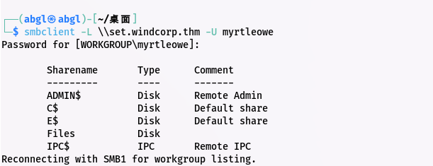 smbclient -L \\\\set.windcorp.thm -U myrtleowe