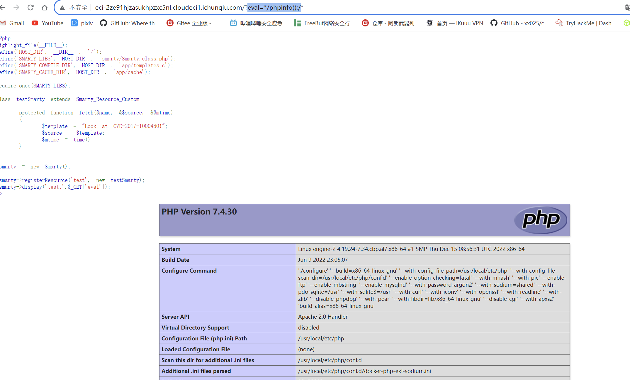 把等号后面那串传给eval,成功执行phpinfo 观察代码