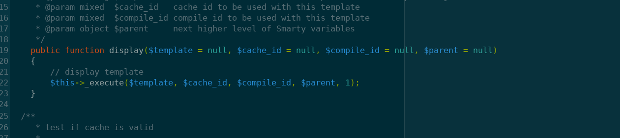 在/libs/sysplugins/smarty_internal_templatebase.php找到了定义display的地方 在display这里调用了execute函数,再接着往下找