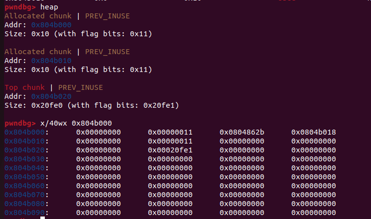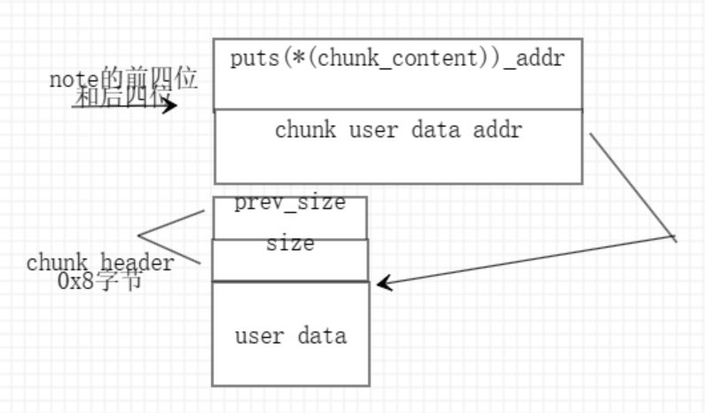 可以看到,虽然只申请了一次,但是有两个chunk,也就是note0和chunk0,并且可以看到note0的后四位指向了chunk0_addr+0x8也就是chunk0 user data的部分