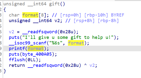 gift()中有printf(format)可以通过格式化字符串漏洞泄露canary的值,而canary在rbp+8的位置上,我们需要输入%7$p 这道题的难度只剩下泄露某个函数地址来ret2libc