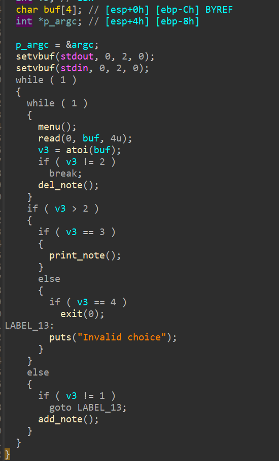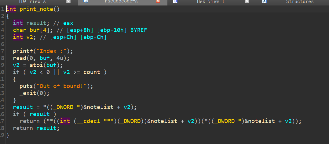 add函数,在申请需要的chunk之前会先申请一个0x8(但是由于32位最小的chunk为0x10,所以实际大小为0x10)的chunk来存放print函数的地址,在这个chunk地址加4的位置存放申请的chunk的地址 所以申请的chunk是print函数的参数