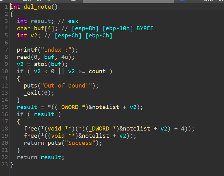 delete函数,把chunk和存放print的地址给free掉,但是chunk的指针没有置null