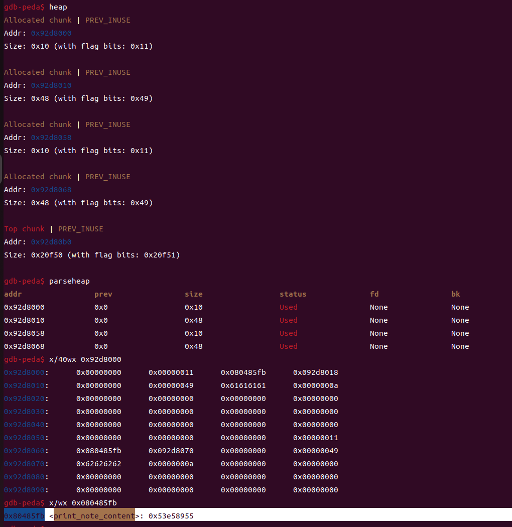 可以看到,虽然申请了两个chunk,但是却给了4个,在第一个0x10的chunk也就是idx0这里先放了0x80485fb也就是print函数的地址,随后跟着申请到的content为aaaa的chunk去掉chunk head的地址