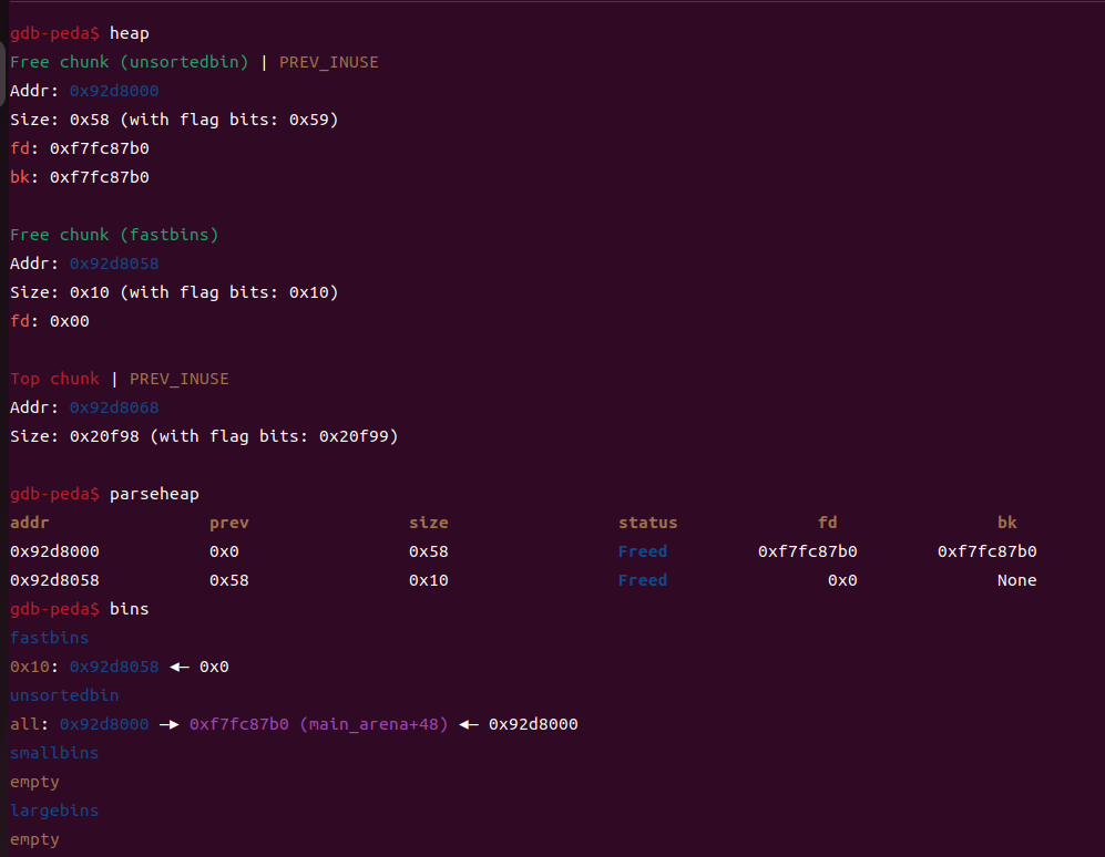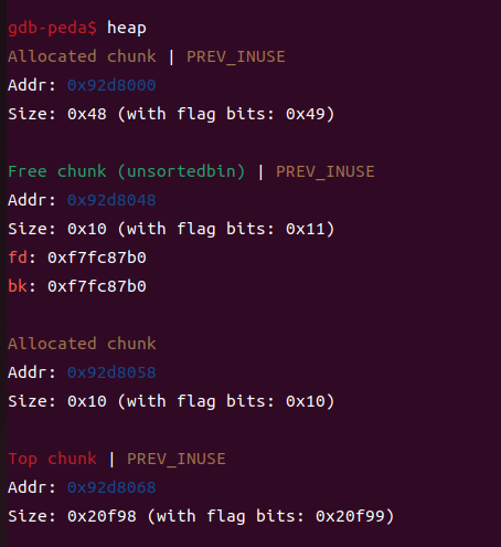 可以看到现在的idx0是idx1并且chunk0是idx0的地址,这是由于申请的两个chunk大小与进到fastbins和unsortedbins的chunk大小符合,所以先把它们切出来