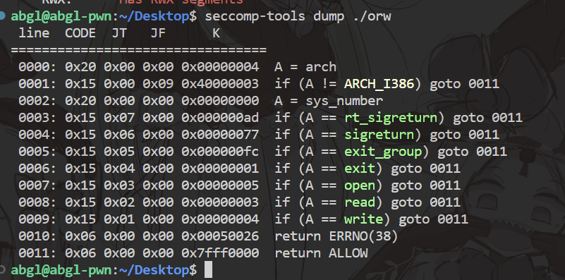 简单来讲第一个prctl会禁用掉execve()函数,并且还会通过clone和fork继承给子进程 第二个prctl呢是只允许使用open read和write函数,并且会把系统调用的函数过滤掉