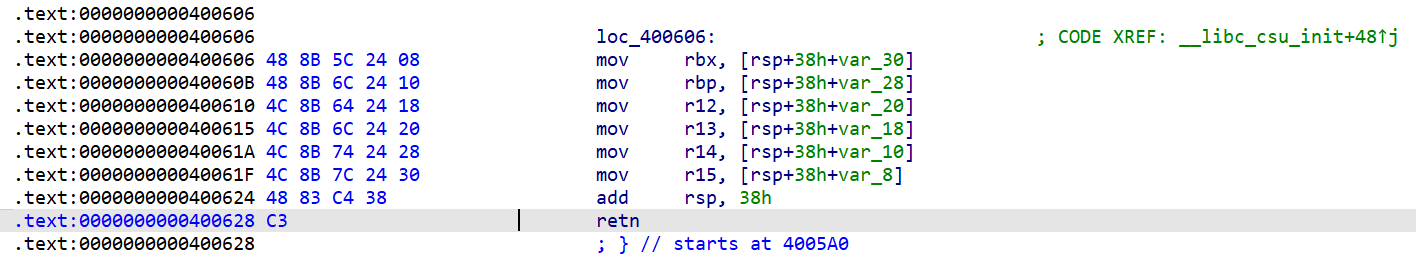 0x0400606–0x0400628这段地址可以通过构造栈溢出来控制rbx,rbp,r12,r13,r14,r15的值,并通过覆盖0x0400628的retn来返回到我们需要的位置