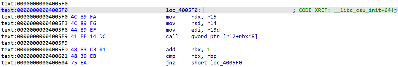 0x04005f0–0x04005f9这段地址中,r15的值赋给rdx,r14的值赋给rsi,r13的值赋给rbi(这里是rdi的低32位,高32位寄存器的值为0,这里只能控制了rdi的低32位)。并且0x04005f9这里有个call是由r12和rbx联合控制,那我们如果控制了r12和rbx岂不是可以call到我们想到的位置。