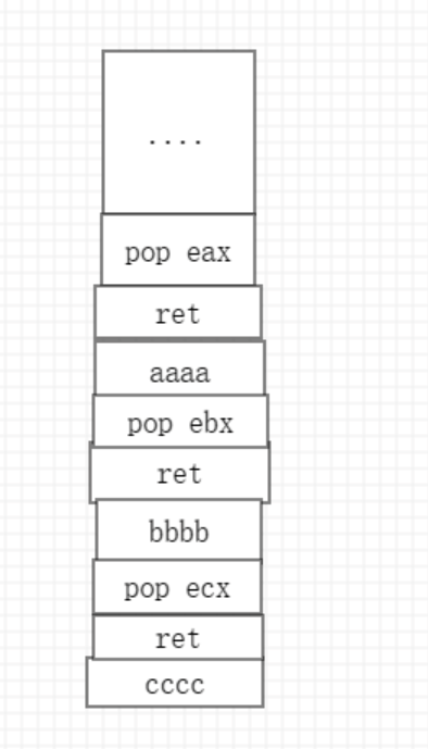 从低址到高址,首先aaaa被放入eax中,执行ret,bbbb被放入ebx中,执行ret,cccc被放入ecx中