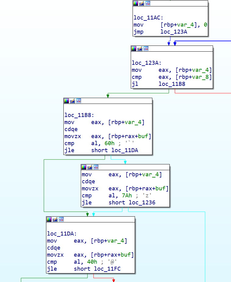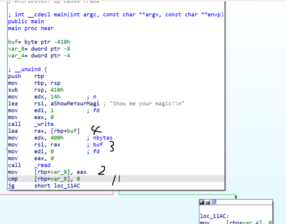从后往前读一下汇编,最底下是一个跳转,而1那里就是跳转的条件,将rbp+var_8和0比较,大于0则跳转到loc_11AC等于0则从红色线路跳转 2那里则说明了rbp+var_8的值就是eax的值 3是把buf的值弹进了rsi寄存器 4是把rbp+buf的值写进rax,而buf有0x400字节,eax是rax低32位,所以eax肯定是大于0的正常的情况下我们会经历一系列的比较跳转