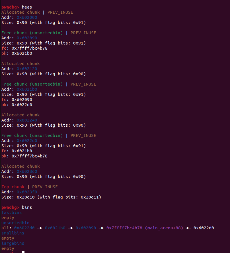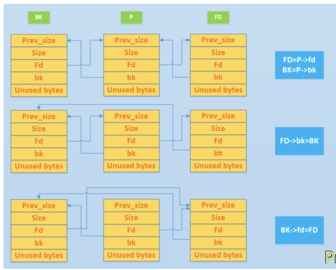 简单来讲就是BK的下一个chunk变成了FD,FD的上一个chunk变成了BK,而被free的chunk则与BK或者FD中处于free状态的合并了 但是这只是small bins的情况,large bins还需要额外注意