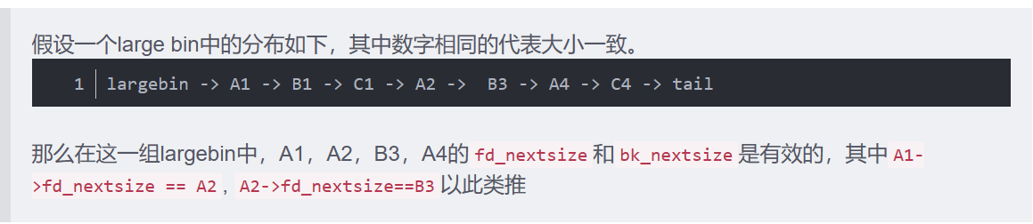 因为fast bins和small bins每一个bins组中chunk大小相同,但是large bins不一定